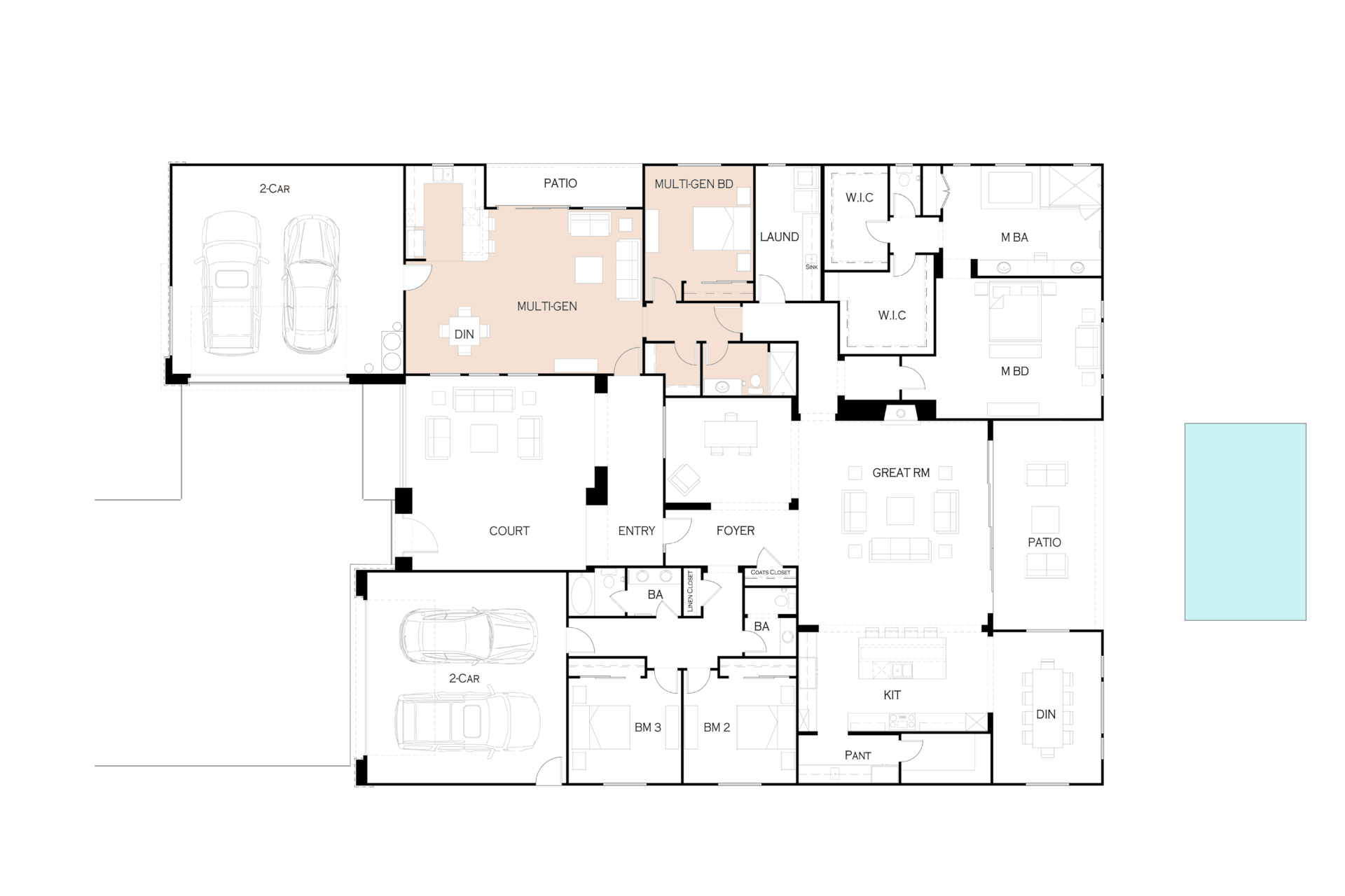 This 1 story Multi-Gen plan has a 4,260 SF, 1 story Main Residence with 4 Bedrooms, Office, 3 1/2 Baths, and a 3 Car Garage. It also has a 965 SF lock-off Suite with its own Full Bath, Laundry hook-up, and