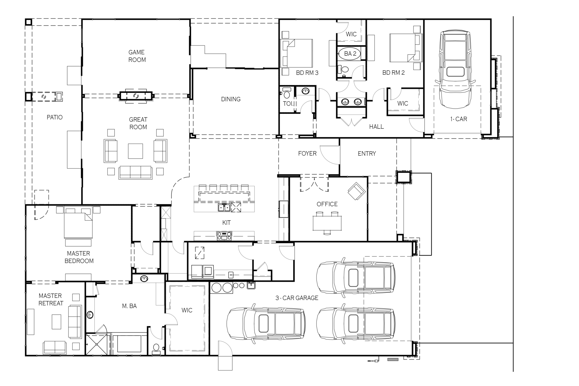 This one-story plan has a 4,190 SF, One story Main Residence with Three Bedrooms, Office, Game Room, 3 1/2 Baths, Guest Suite Option, and 4 Car Garage.