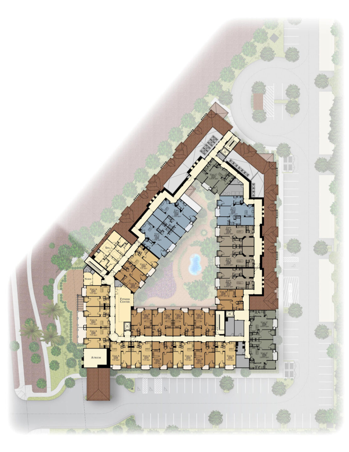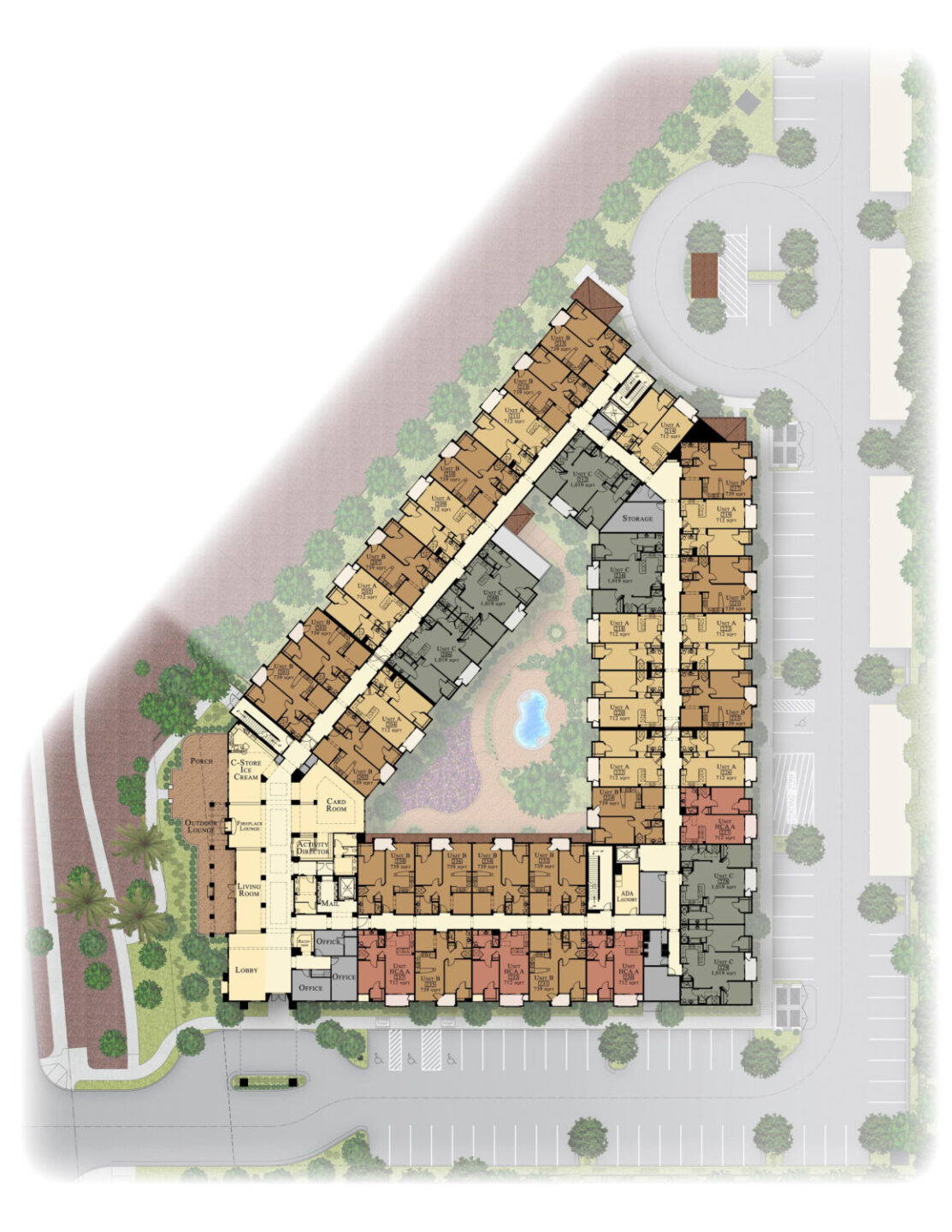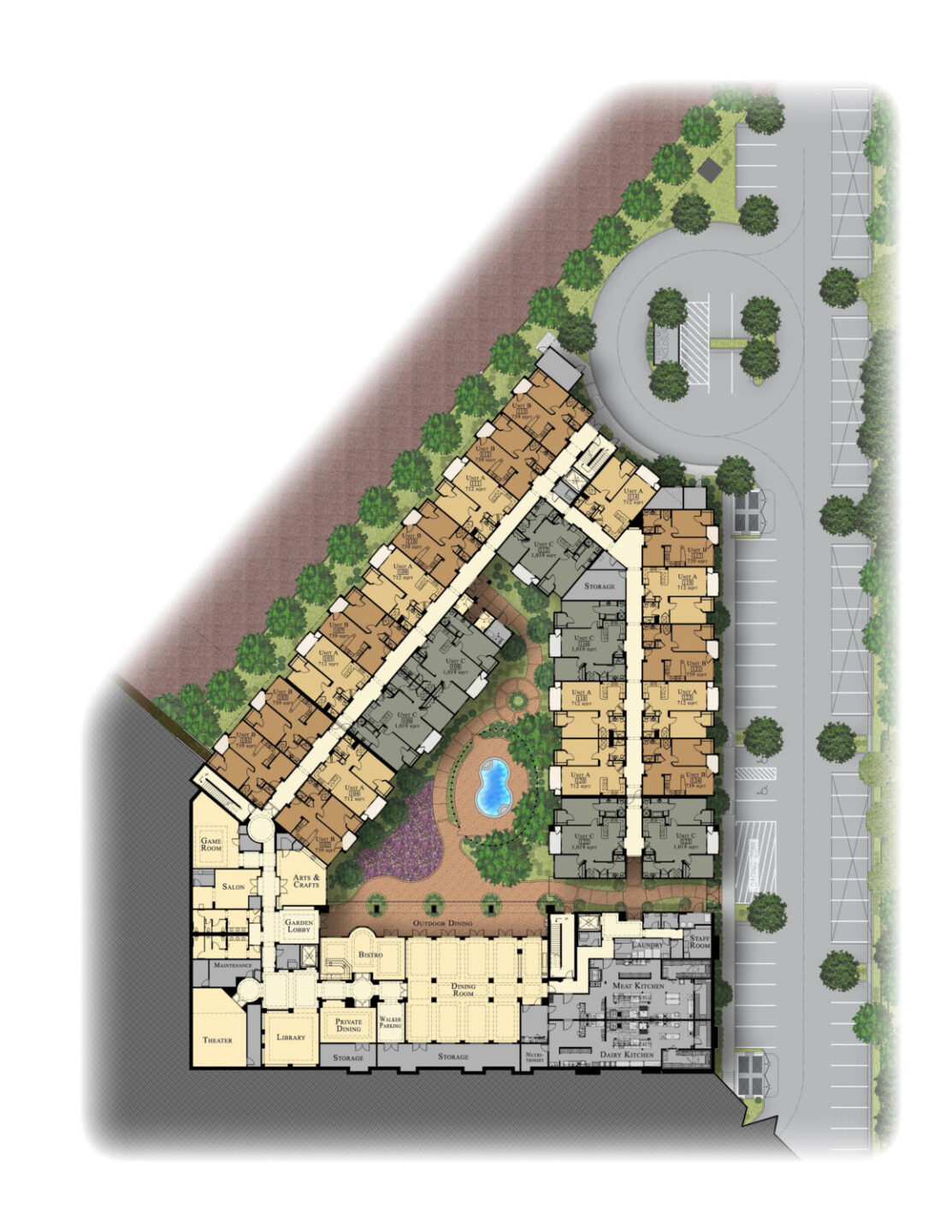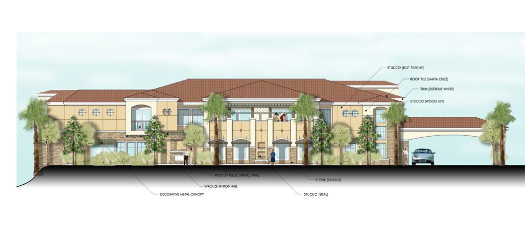 Merrill Gardens is a 88 unit, three-story, type V wood frame garden-style AL/IL project. Situated on 3.1 net acres, the project’s density is 28.5 /net acre. This project, in the heart of Green Valley, offers its residents, a pool, 2,000 SF of covered patio in its private courtyard, and a raised patio overlooking the beautifully landscaped GVR jogging trail. SRM, the Developer and General Contractor completed the project in 2009. Consultants include Wright Engineering (Structural), Comfort Engineering (MPE), and JHA + Associates (Landscape).