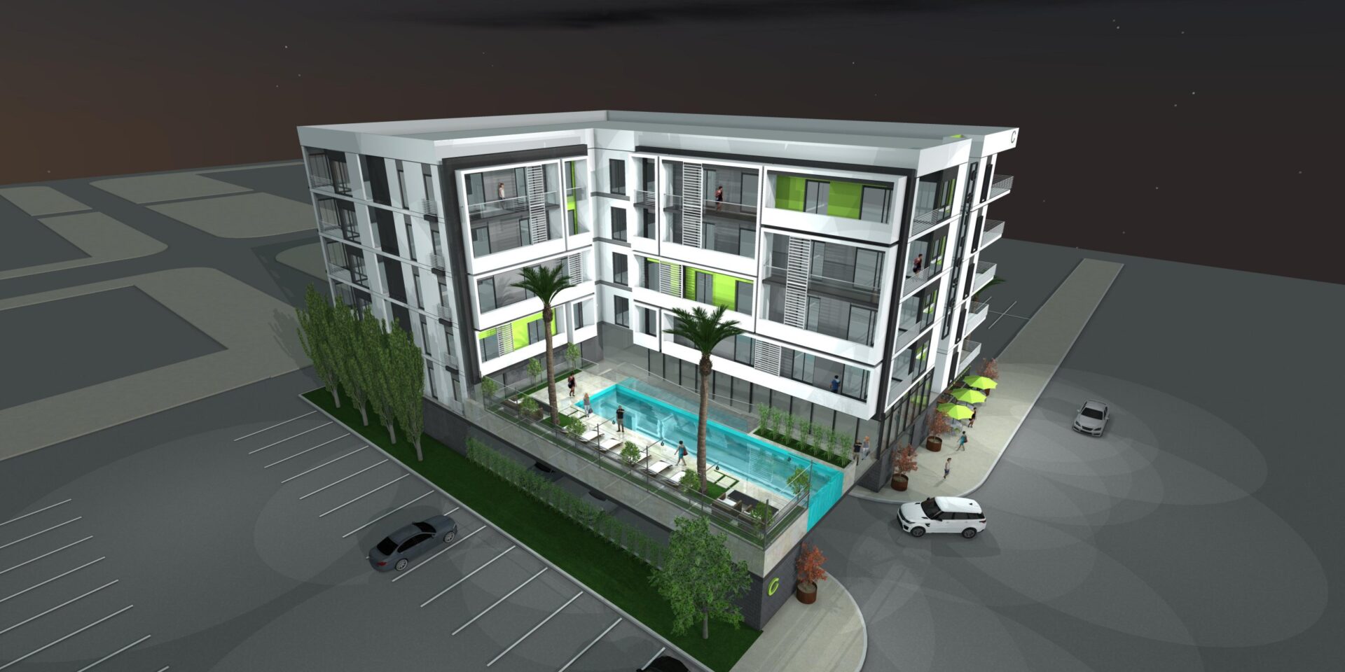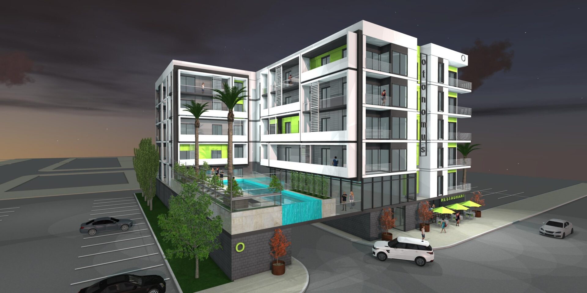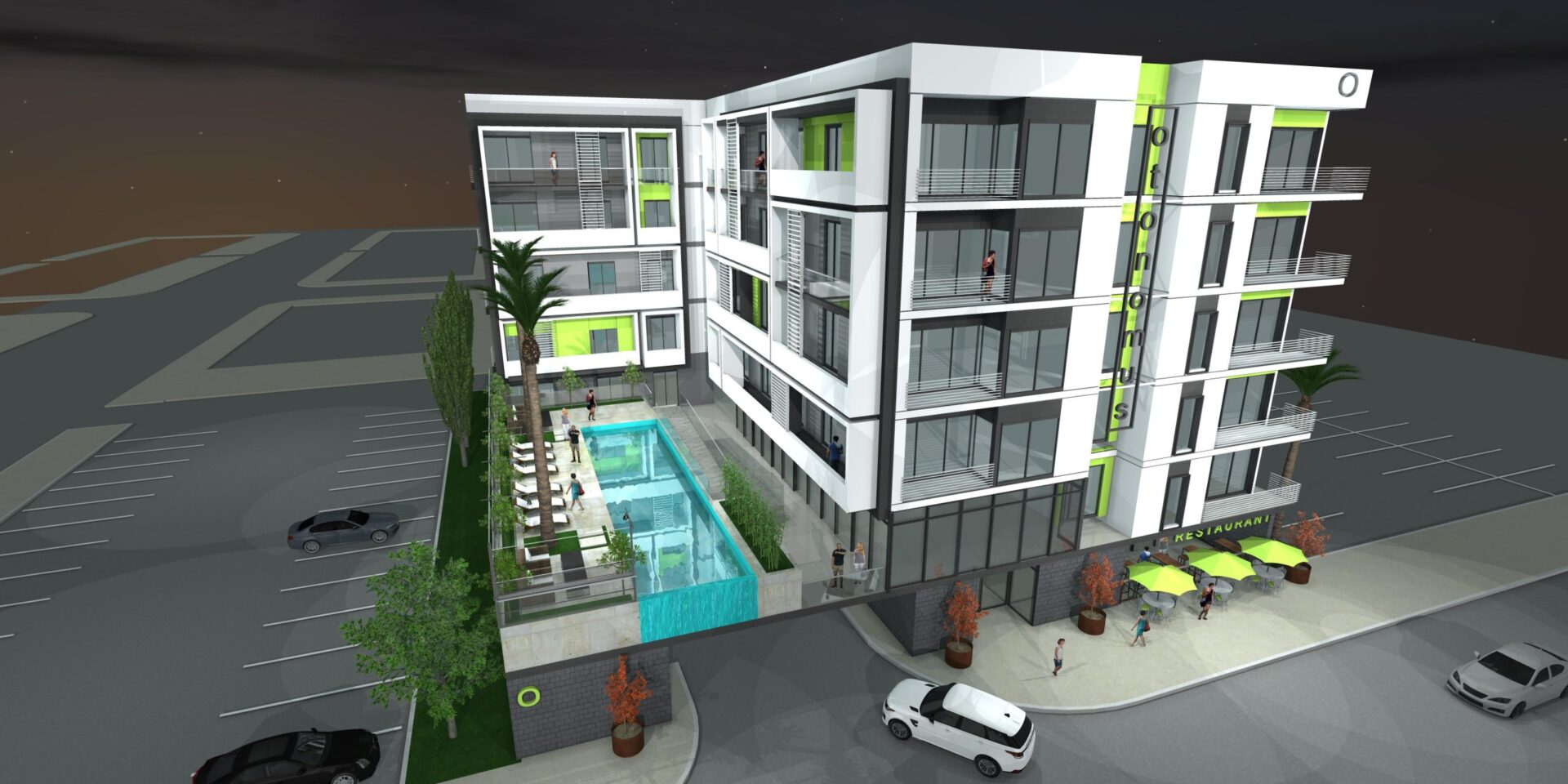 Located directly across the street from the Container Park, Otonomus – Downtown is a four-story, wood frame, 47 unit, Airbnb Hotel built over a concrete podium with 17 parking spaces at grade. Amenities include a swimming pool and clubhouse. Sitting on .4 net acres of land, Otonomus has a density of 91.1 u/gross acre and 117.5 u/net acre. This project is due to break ground in spring 2023.